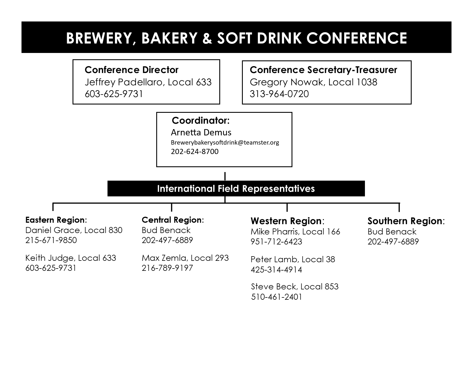 The Brewery, Bakery, & Soft Drink Conference of the Teamsters Union brings together members employed in the brewing and soft drink industries, as well as allied industries such as fruit juices, liquor, bottled water and can manufacturing. Responsibilities of the conference include: assistance in contract negotiations and organizing; implementation of national master agreements; administration of grievance panels; and coordination of legislative activity. A conference with a proud history, some locals in the conference date back to the 1800s.